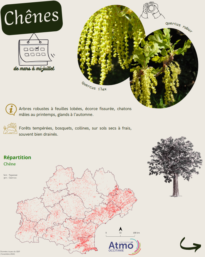 La saison pollinique s'installe progressivement en Occitanie. A partir de mi-février et début mars il faudra être vigilants pour : le platane, les chênes et les Urticacées. Tous ces végétaux ont des périodes de floraisons longues, qui s’étalent jusqu’à l’été (voire jusqu'en septembre pour la famille des Urticacées !).