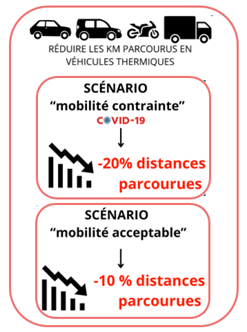 Le deuxième scénario vise à évaluer l’impact d’une réduction des distances parcourues en véhicules thermiques selon 2 cas :