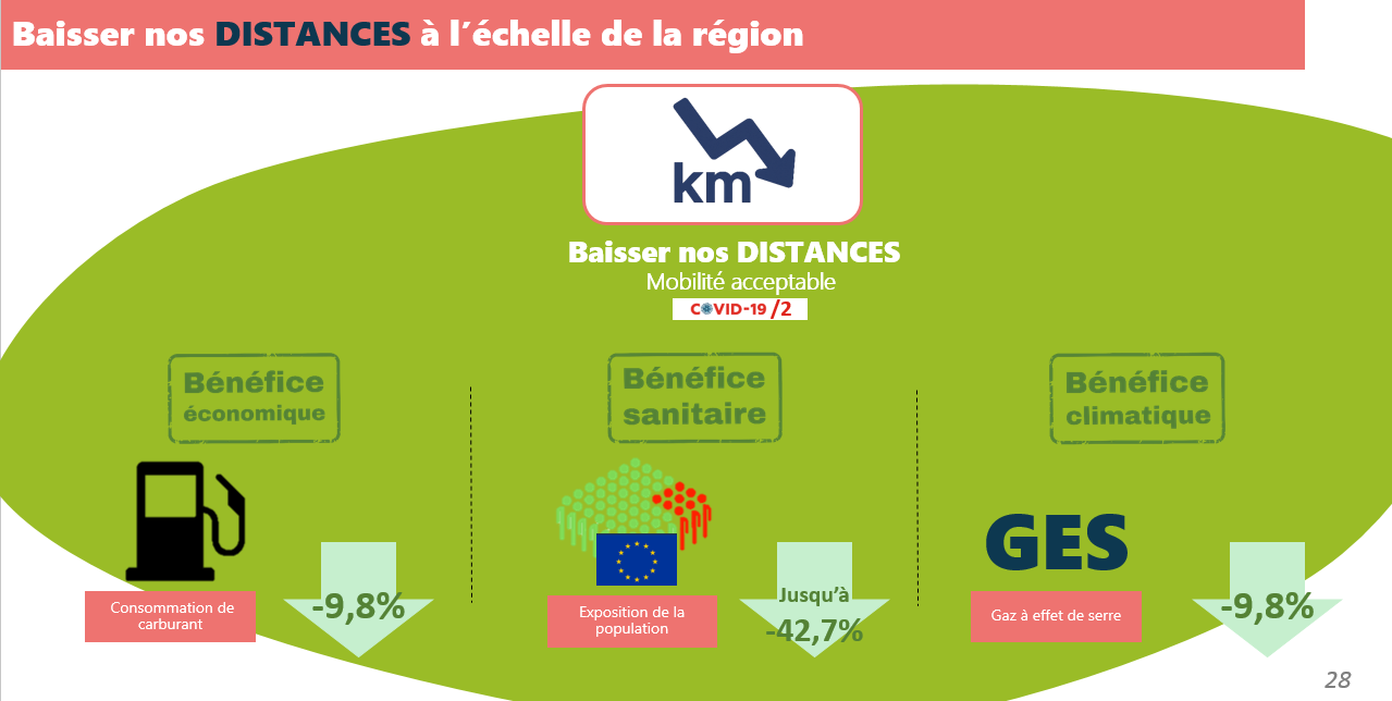 - Scénario “mobilité contrainte” : basé sur la baisse moyenne des distances parcourues observée durant la crise COVID. Cela correspond à -20% des distances parcourues.